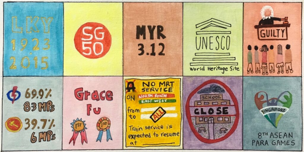 2015 Posted on 10/05/2015 by rojaks Reply Lee Kuan Yew passed away on 23rd March Spore celebrates her golden jubilee Ringgit falls to a 17 year low against the Sing dollar Spore Botanic Garden declared UNESCO world heritage site All 6 accused found guilty in City Harvest Church trial General election 2015 Grace Fu – 1st female full minister , 1st female leader of the House First time both major MRT lines break down at the same time Primary & secondary schools closed due to haze Singapore hosts ASEAN Para Games for the 1st time